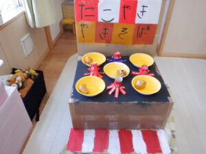 幼児クラスのお店屋さんごっこがありました★みんなで作品を作り楽しく行う事ができました!夕方には盆踊りもありましたよ♪