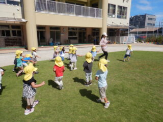 やっと夏の暑さが抜けて戸外遊びが思いっきりできる時期になりました!2歳児クラスでは集団遊び「しっぽ取り」が大人気!広い芝生で思い切り走っています!芝が柔らかくて転んでも痛くないね★